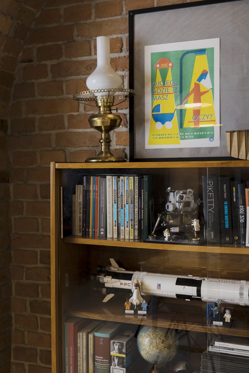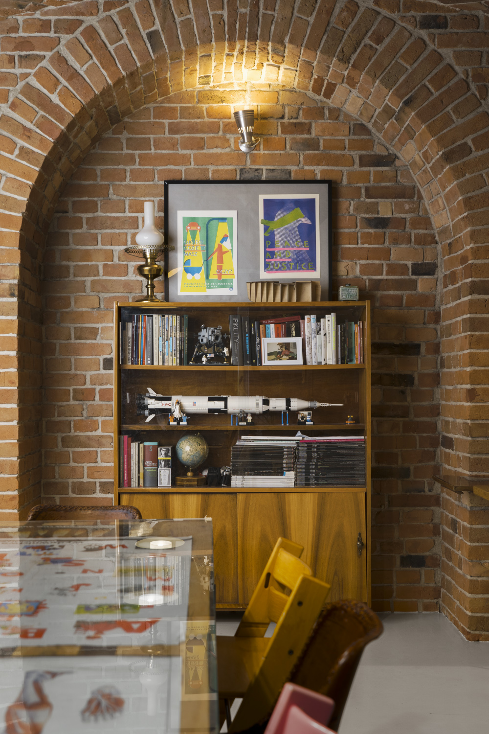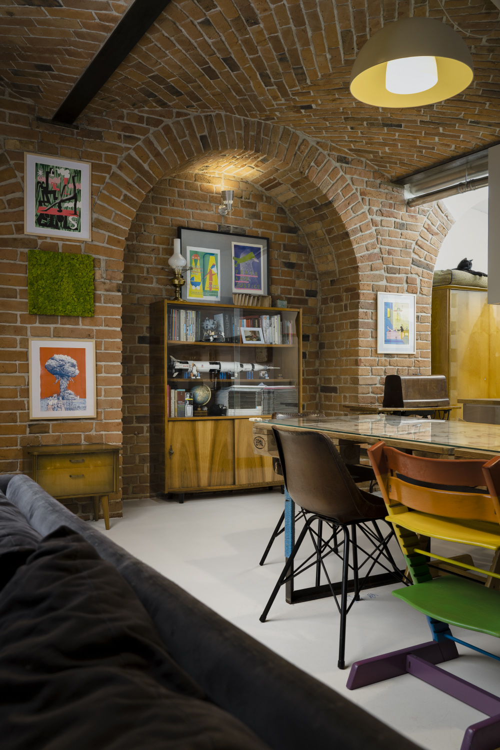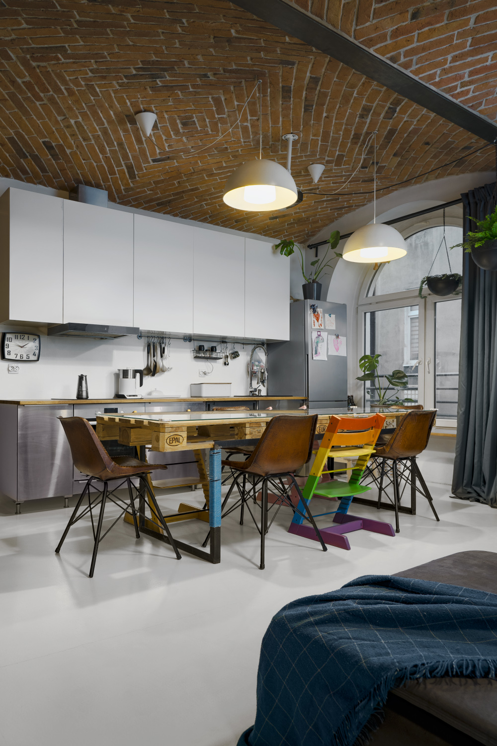 Loft nic sobie nie robi z pękającej miejscami żywicznej posadzki, gdzieniegdzie upstrzonej uciesznymi bazgrołami. Nie obchodzi go podział przedpokoju na pokój dziecięcy i kocięcy, z miejscem na pojemniki pełne dziewczyńskich zabawek, i drapak dla Pawła i Packa. Nie zastanawia go, że w sypialni leżą obok siebie trzy materace, na których w uścisku zasypia cała rodzina, i przechowalnia urządzona w otwartej wnęce — zaślepionym dawnym wejściu do windy. Ma gdzieś, że zmywarce do zabudowy brakuje panelu na froncie, że drzwiczki lodówki przeistoczyły się w realizację zajmującą pełnoprawne miejsce obok wyszukanych grafik, i że wpadające do wnętrz południowe światło przypomina to mdłe, północne.