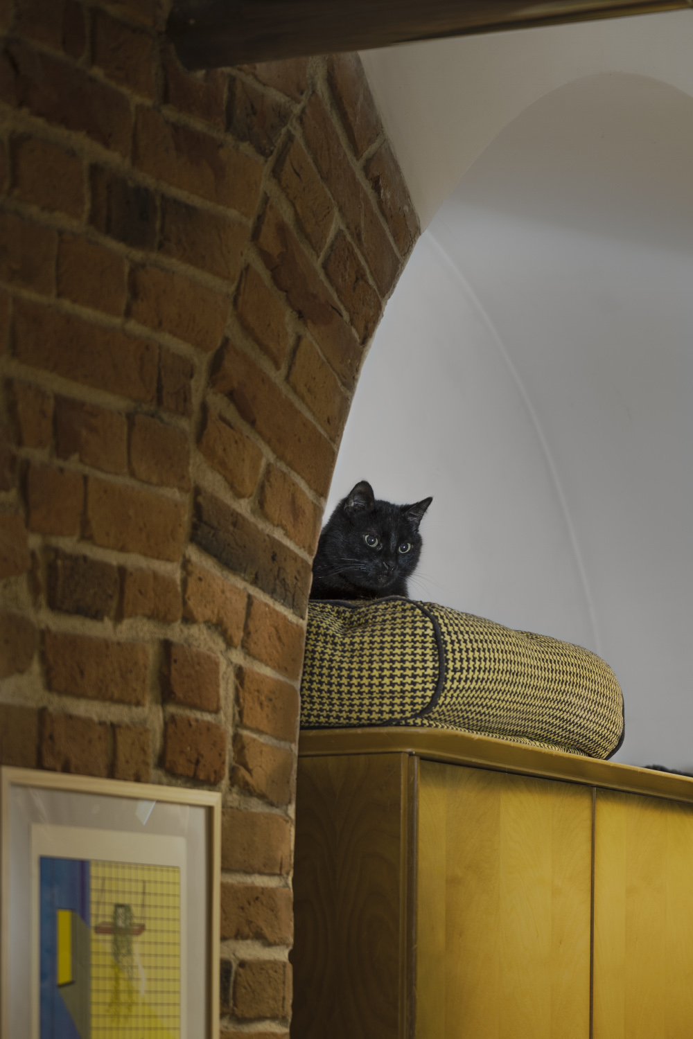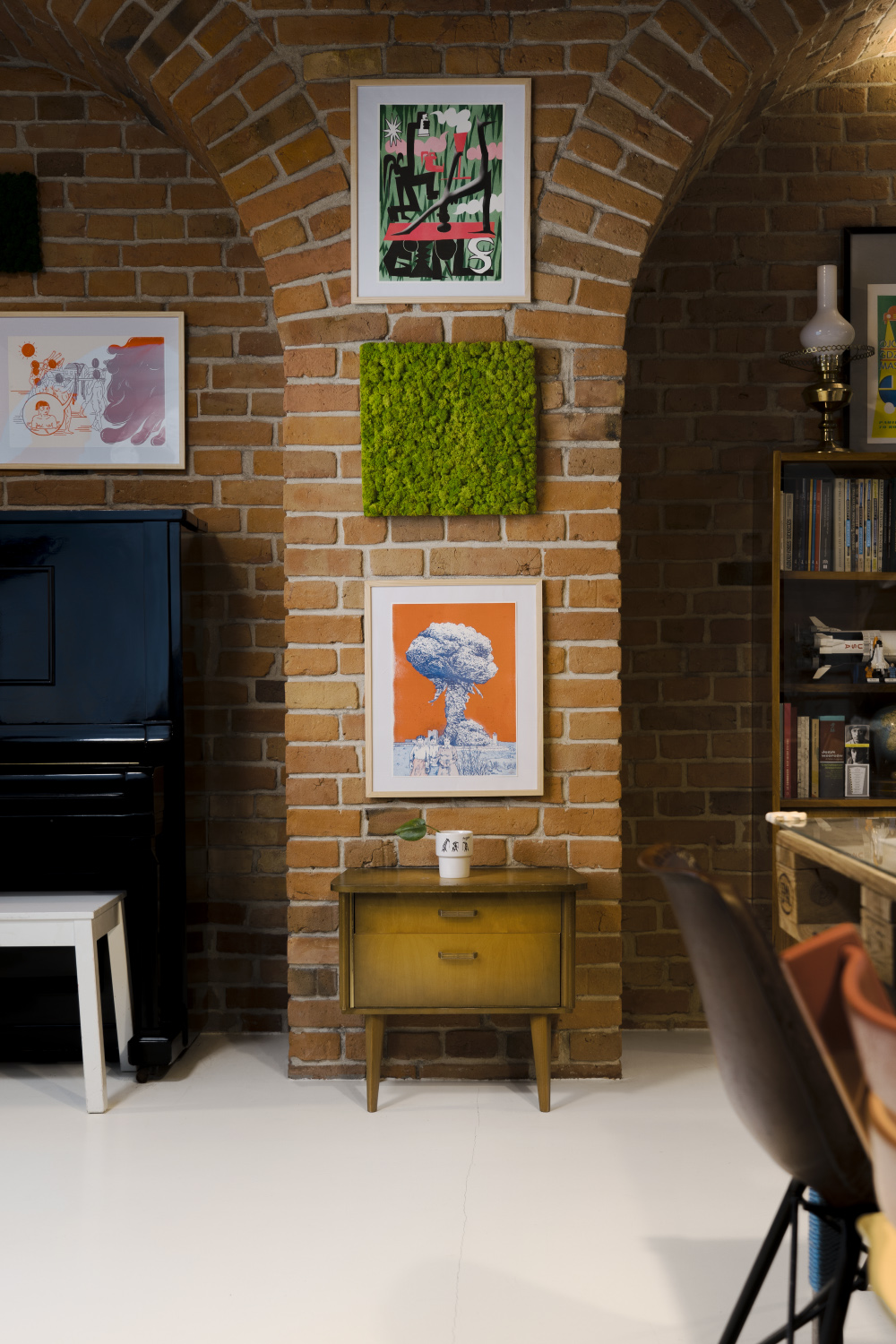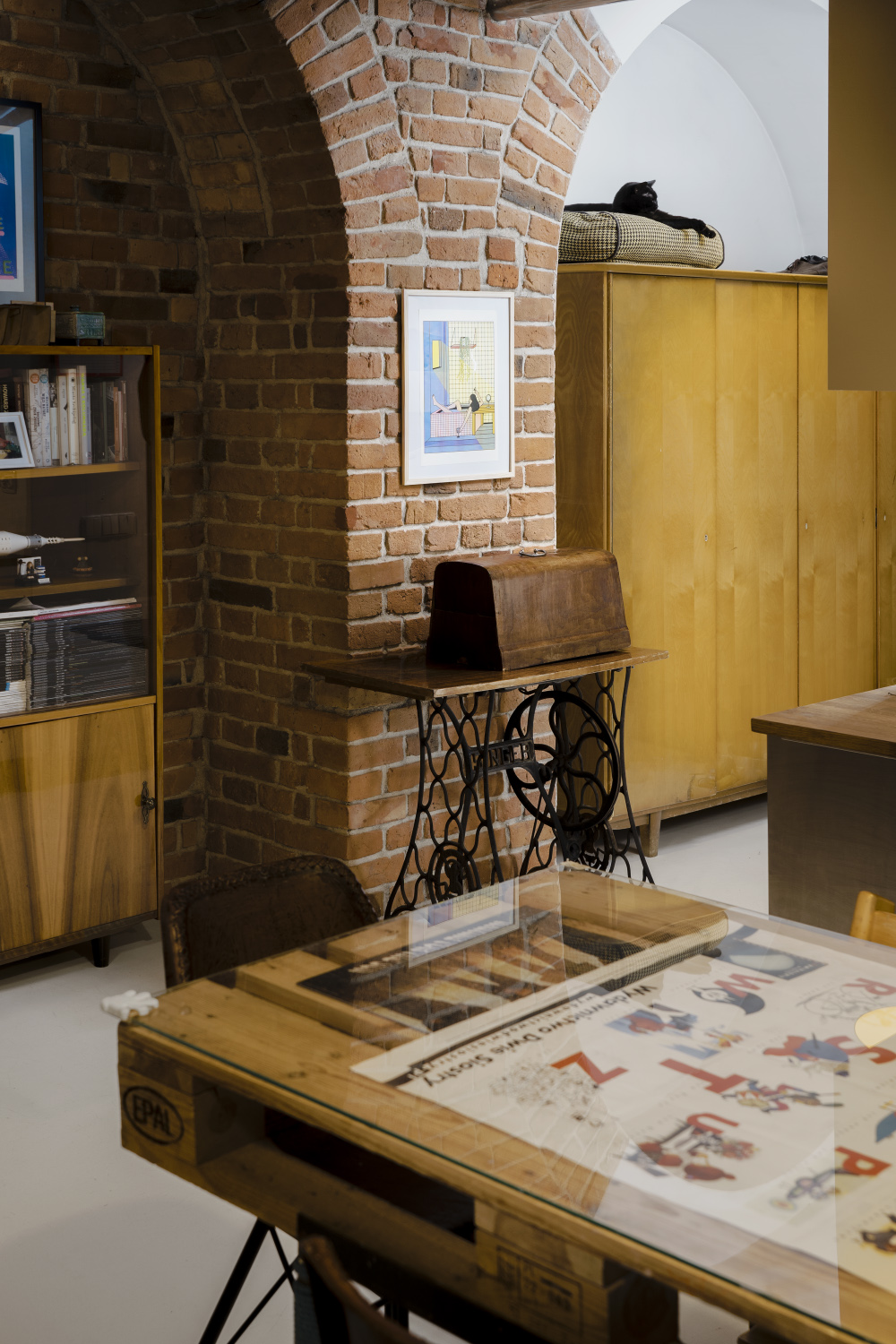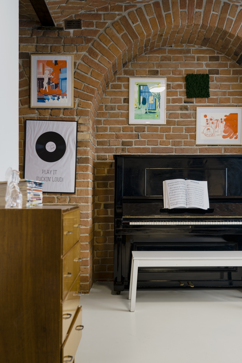 Loft nic sobie nie robi z pękającej miejscami żywicznej posadzki, gdzieniegdzie upstrzonej uciesznymi bazgrołami. Nie obchodzi go podział przedpokoju na pokój dziecięcy i kocięcy, z miejscem na pojemniki pełne dziewczyńskich zabawek, i drapak dla Pawła i Packa. Nie zastanawia go, że w sypialni leżą obok siebie trzy materace, na których w uścisku zasypia cała rodzina, i przechowalnia urządzona w otwartej wnęce — zaślepionym dawnym wejściu do windy. Ma gdzieś, że zmywarce do zabudowy brakuje panelu na froncie, że drzwiczki lodówki przeistoczyły się w realizację zajmującą pełnoprawne miejsce obok wyszukanych grafik, i że wpadające do wnętrz południowe światło przypomina to mdłe, północne.