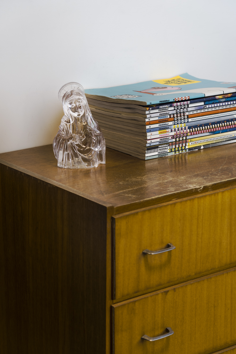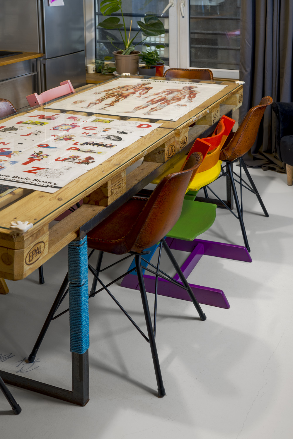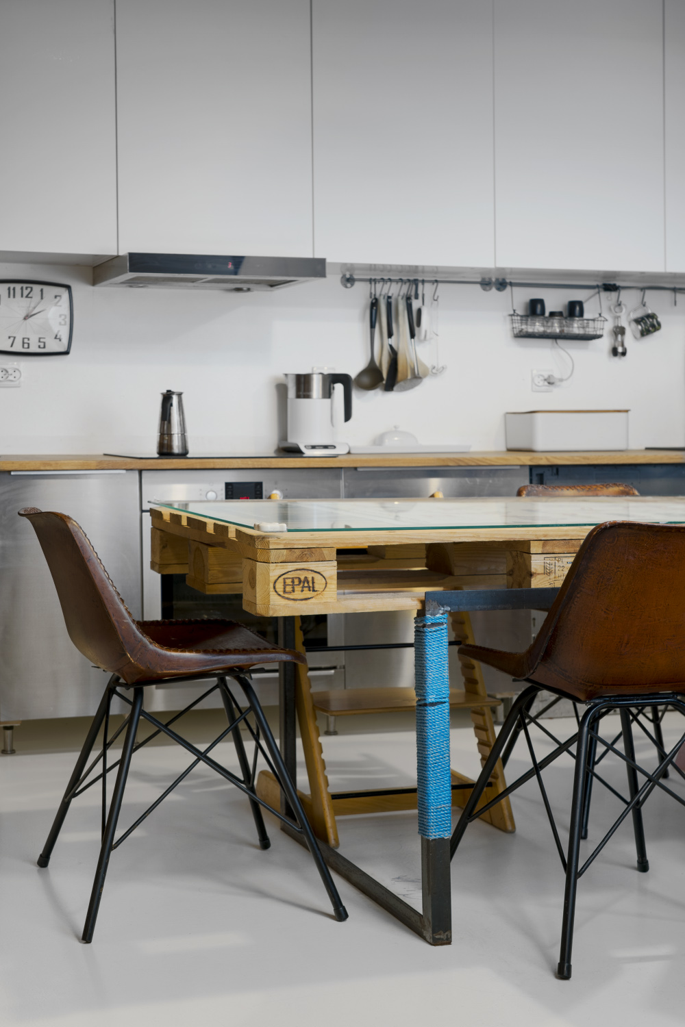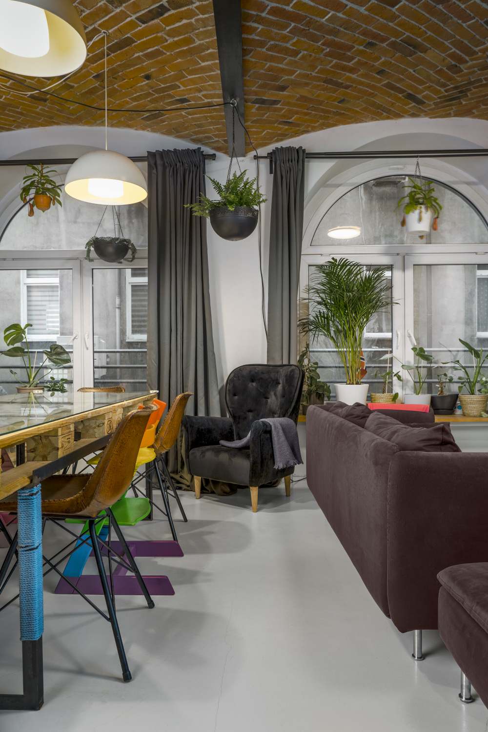 Loft nic sobie nie robi z pękającej miejscami żywicznej posadzki, gdzieniegdzie upstrzonej uciesznymi bazgrołami. Nie obchodzi go podział przedpokoju na pokój dziecięcy i kocięcy, z miejscem na pojemniki pełne dziewczyńskich zabawek, i drapak dla Pawła i Packa. Nie zastanawia go, że w sypialni leżą obok siebie trzy materace, na których w uścisku zasypia cała rodzina, i przechowalnia urządzona w otwartej wnęce — zaślepionym dawnym wejściu do windy. Ma gdzieś, że zmywarce do zabudowy brakuje panelu na froncie, że drzwiczki lodówki przeistoczyły się w realizację zajmującą pełnoprawne miejsce obok wyszukanych grafik, i że wpadające do wnętrz południowe światło przypomina to mdłe, północne.
